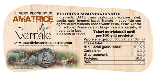 Il Vernale occupa un posto speciale nella produzione de L'AMATRICIANO grazie alla esclusività della ricetta alla quale si ispira. Essa prevedeva che il miglior Vernale venisse prodotto in primavera con latte di pecora ottenuto dai ricchi pascoli in fiore delle pianure di svernamento, nell’imminenza dell’anelato viaggio di ritorno che i pastori con le loro greggi avrebbero presto intrapreso verso Amatrice e le amate montagne. Un formaggio mai di lunga stagionatura, molto ricercato perché dolce e saporito, con note fragranti assolutamente personali e piacevolissime.